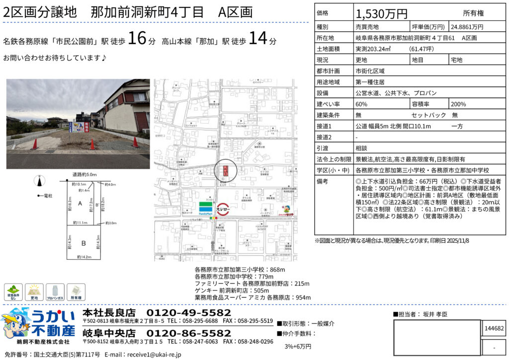 | 備考 | 各務原市⽴那加第三⼩学校:868m 各務原市⽴那加中学校:779m ファミリーマート 各務原那加前野店:215m ゲンキー 前洞新町店:505m 業務⽤⾷品スーパー アミカ 各務原店:954m ◎ 上下水道引込負担金:66万円(税込) ◎ 下水道受益者負担金:500円/㎡ ◎ 司法書士指定 ◎ 都市機能誘導区域外・居住誘導区域内 ◎ 地区計画:前洞A地区(敷地最低面積150㎡) ◎ 法22条区域 ◎ 高さ制限(景観法):20m以下 ◎ 高さ制限(航空法):61.1m ◎ 景観法:まちの風景区域 ◎ 西側寄り越境あり(覚書取得済み) |