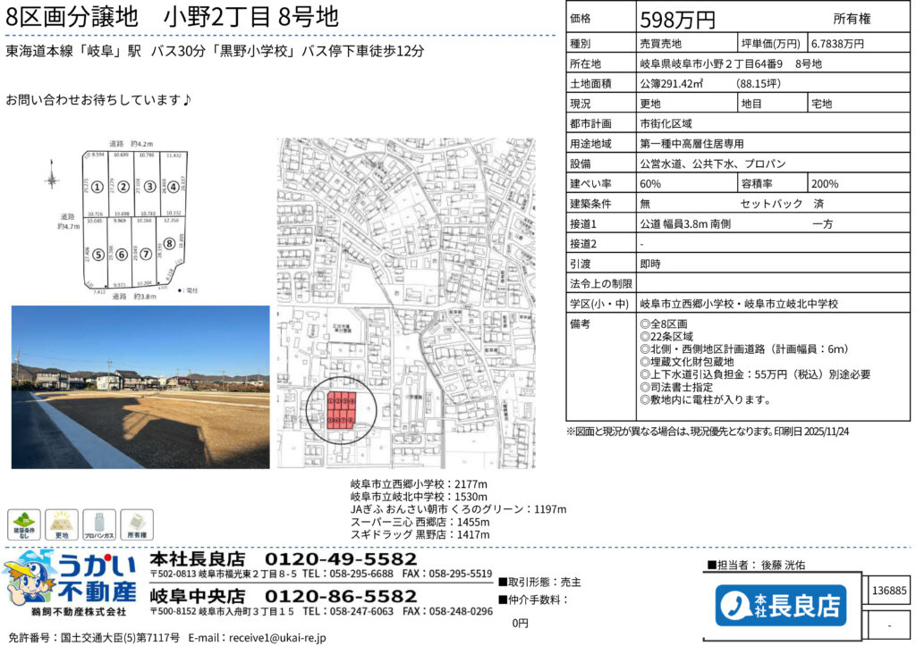 | 備考 | 岐阜市立西郷小学校:2,177m 岐阜市立岐北中学校:1,530m JAぎふ おんさい朝市 くろのグリーン:1,197m スーパー三心 西郷店:1,455m スギドラッグ 黒野店:1,417m ◎ 全8区画 ◎ 22条区域 ◎ 北川・西側地区計画道路(計画幅員:6m) ◎ 埋蔵文化財包蔵地 ◎ 上下水道引込負担金:55万円(税込)別途必要 ◎ 司法書士指定 |