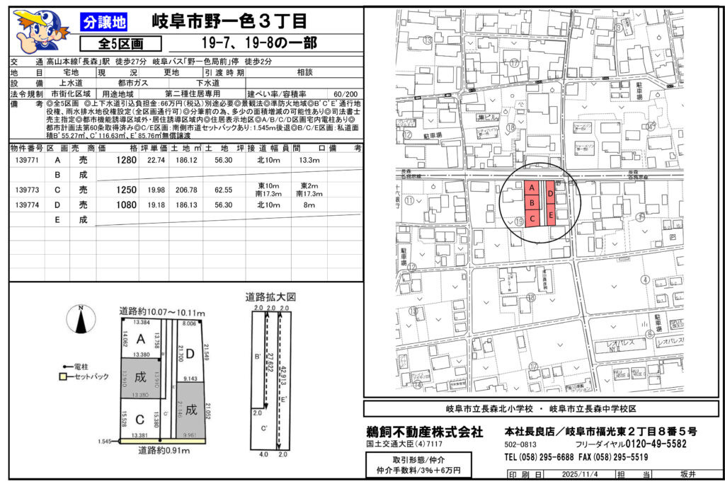 | 備考 | ◎ 上下水道引込負担金:66万円(税込) ◎ 準防火地域 ◎ B’C’E’通行地役権、雨水排水地役権設定(全区画通行可) ◎ 分筆前の為、多少の面積増減の可能性あり ◎ 司法書士売主指定 ◎ 住居表示地区 ◎ A/B/C/D区画宅内電柱あり ◎ 都市計画法第60条取得済み ◎ C/E区画・南側市道セットパックあり:1,545m後退 ◎ B/C/E区画:私道面積B’ 55.27 ㎡、C’ 1163.63 ㎡、E’ 85.76 ㎡無償譲渡 |