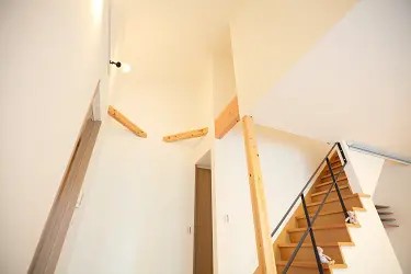 - ここがポイント: リビングの吹き抜けには、室内でありながらバルコニーのような「突き出し廊下」があり、遊び心のあるナチュラル空間を実現しています。