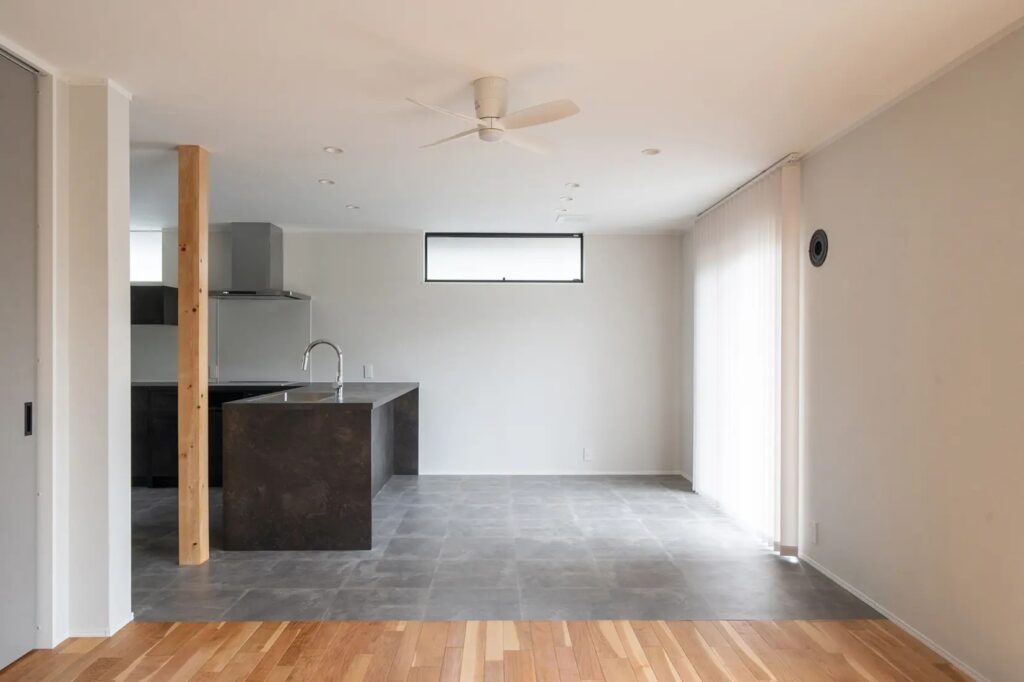キッチンから食事を出しやすいダイニングスペースに。リビングとのエリアも素材できちんと分けられてます。
