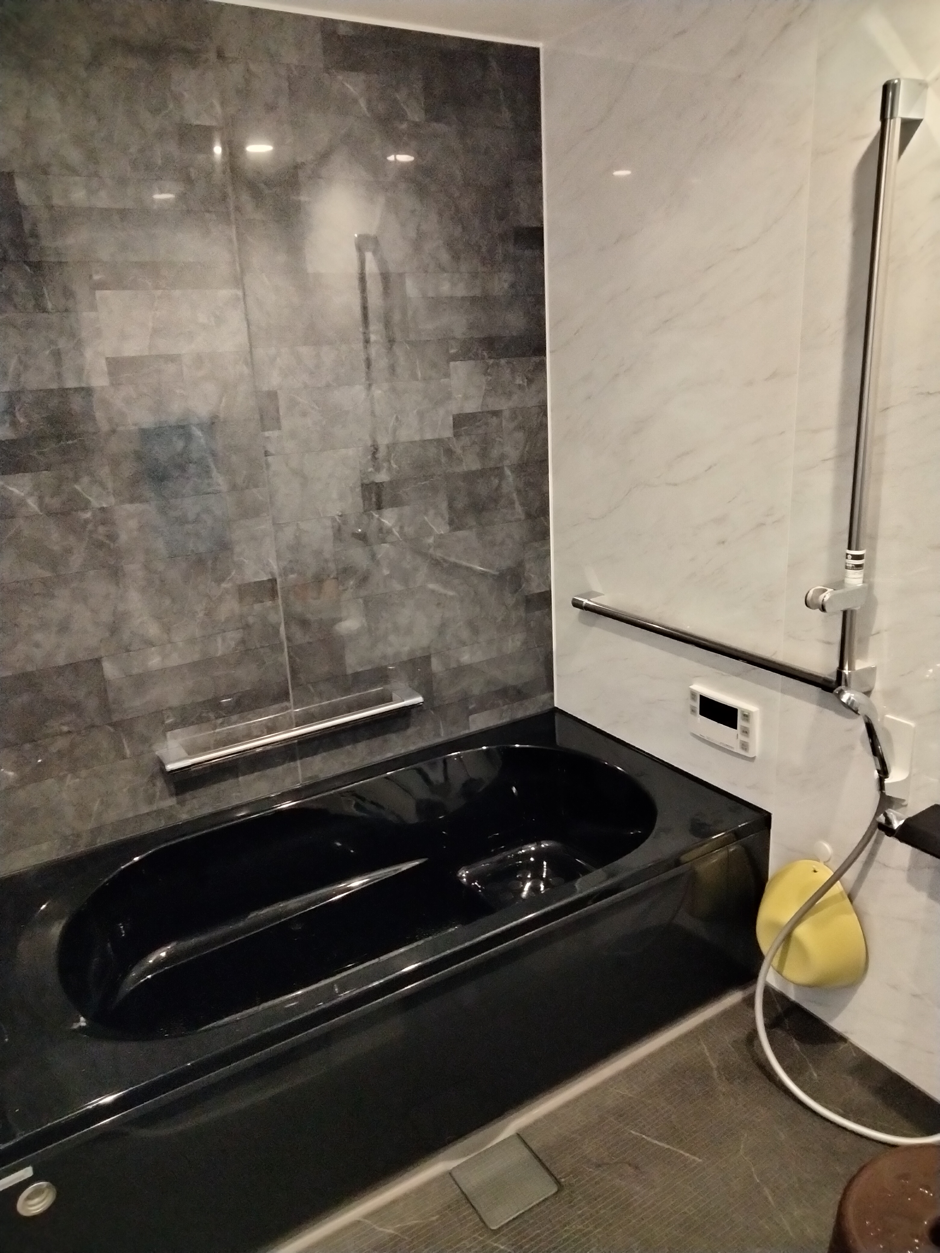 明るいタイルから一転、黒の浴槽と石目調のアクセントパネルを採用。ホテルのような贅沢な空間を演出しました。