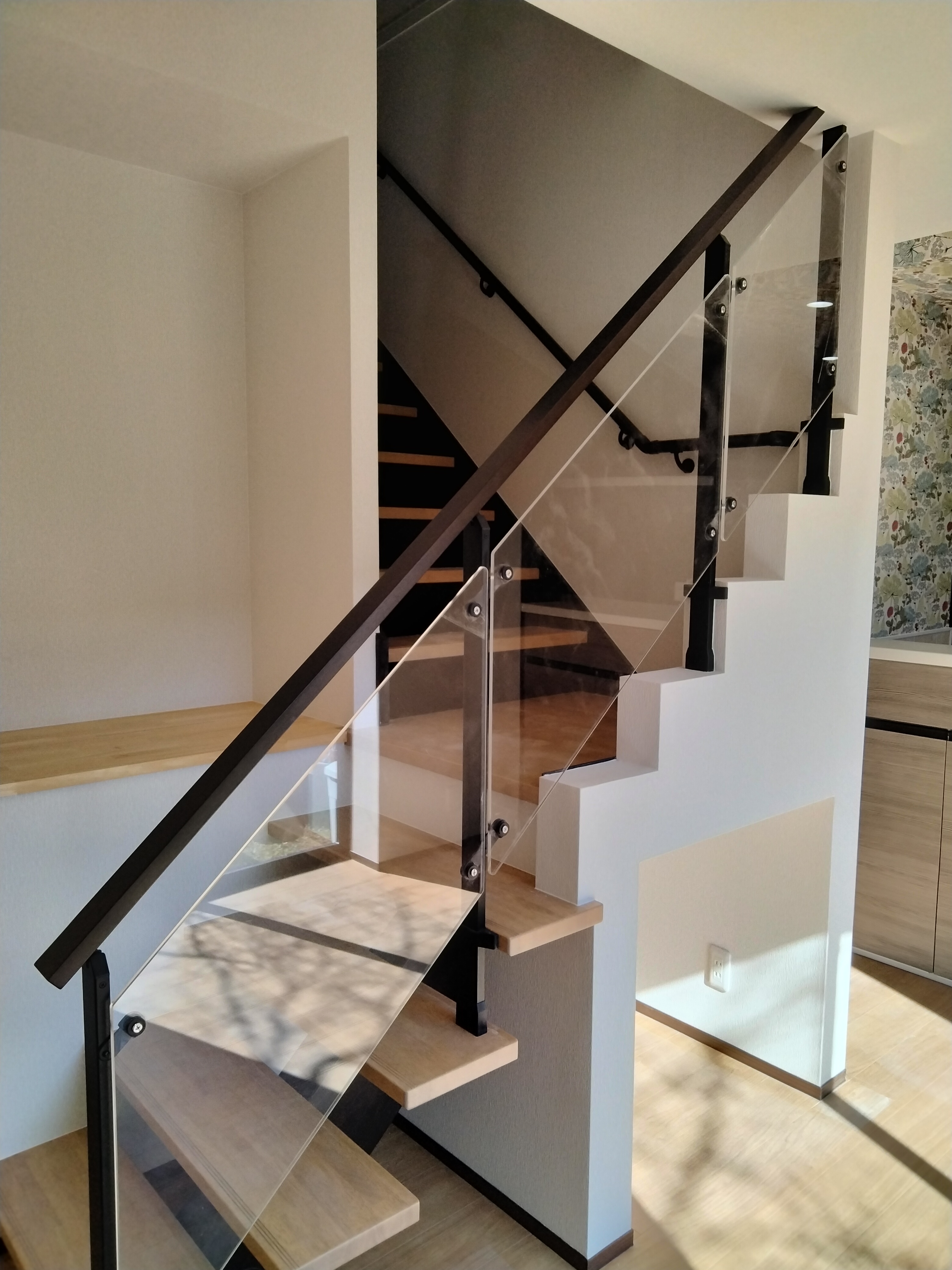 踏み板には温かみのある木目を、手すりにはシャープなブラックアイアンとクリアパネルを採用。視線を遮らない透明感のある仕上がりが、空間の広がりを演出します。